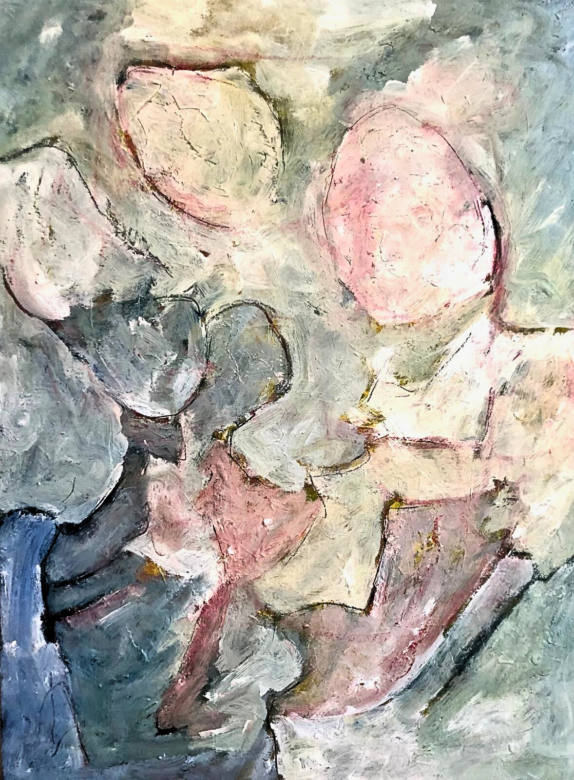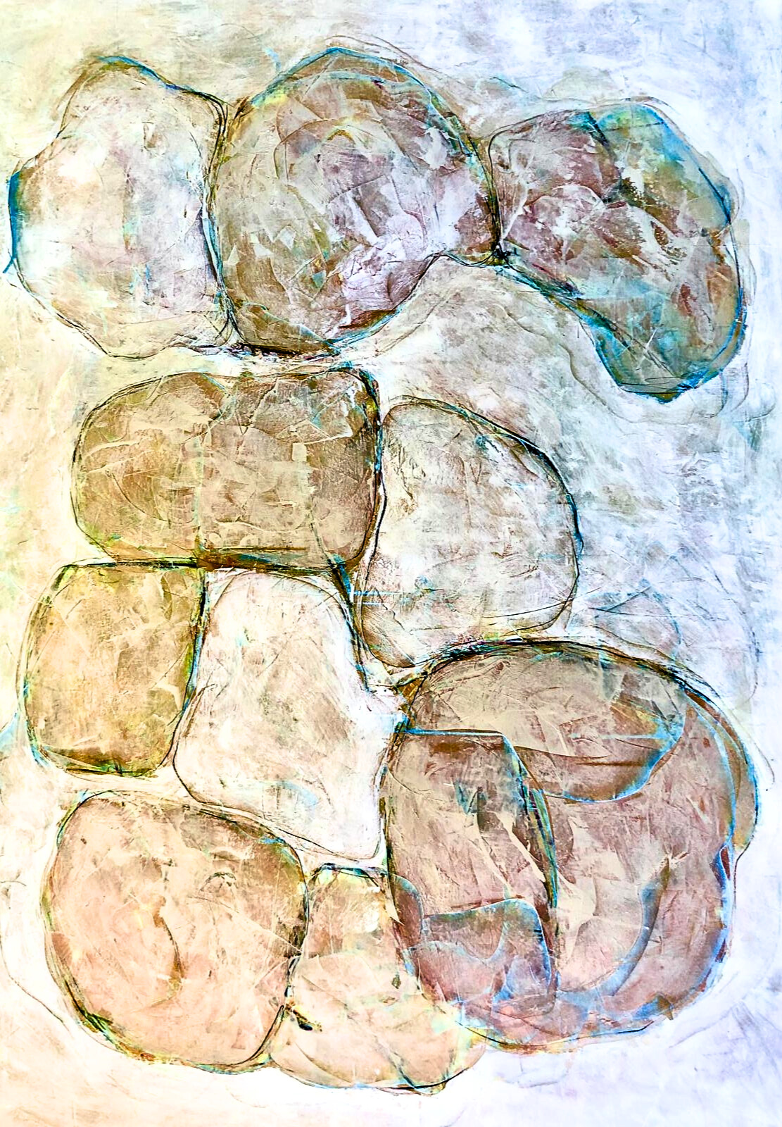 Adrian Bol presents a composition that feels assembled rather than painted — as if each form has been placed with intention after having been wrested from resistance. The surface is built from layered, translucent shapes that resemble stones or sealed vessels, stacked and leaning into one another, forming a quiet but resolute structure.