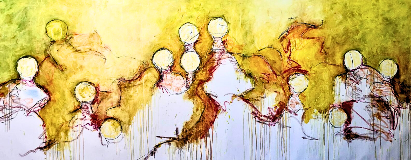 Bol’s layered technique mirrors the process of passage. Broad, assertive brushstrokes establish the forms, while scratched lines and repeated contours testify to resistance met and overcome. The figures overlap deliberately, reinforcing a sense of shared ground — a household that has stood firm while moving through the unseen pressures that surround it.